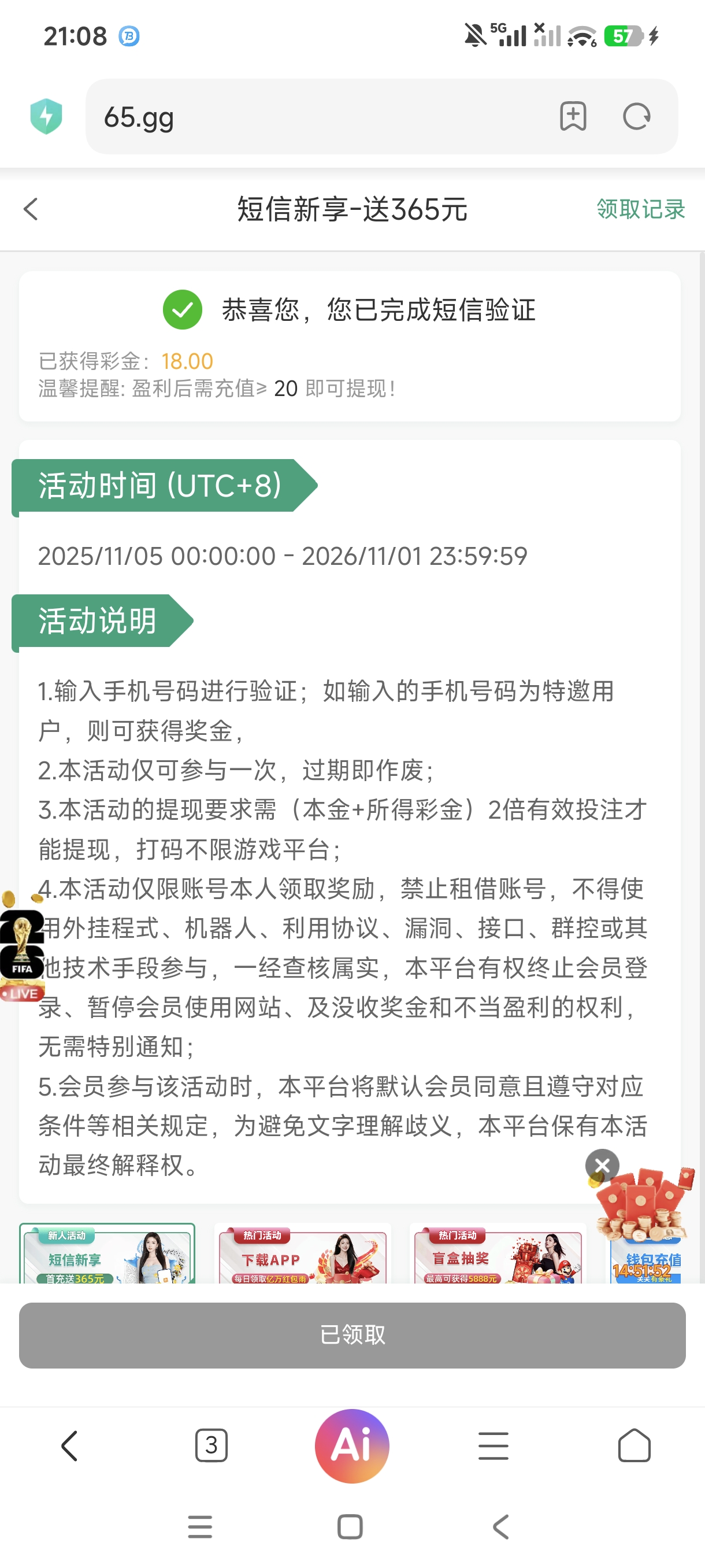 365娱乐特邀8-365元,不限制游戏,2倍流水。提款需要充20才能提